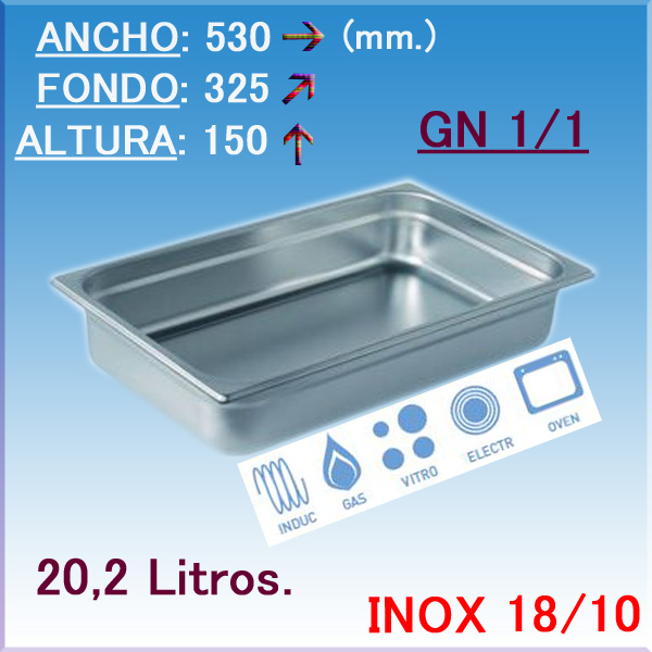 - Cubeta Gastronorm GN 1/1, construida totalmente en acero inoxidable. - Cubeta GN, con fondo difusor: Únicas adaptadas a la cocción en placas de Inducción, mediante fondo sandwich.