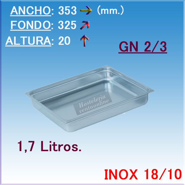 - Cubeta Gastronorm GN 2/3, construida totalmente en acero inoxidable. - Posibilidad de acoplar asas móviles o fijas.