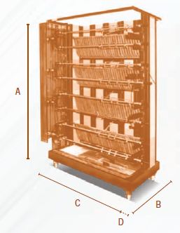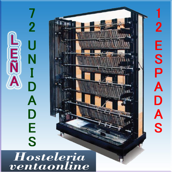 - MEDIDAS (mm.): 1540 X 900 X 1930 (Ancho x Fondo x Alto) - CAPACIDAD: 72 Unidades. - ESPADAS: 12. - ASADOR DE POLLOS DOBLE ESPADA DE LEÑA.