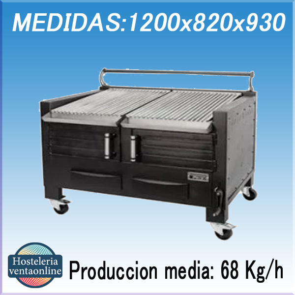 Ideal para exterior con parrilla extraíble acanalada e interior de hierro fundido. Medidas:1.200x820x930 mm. Cocción mediante carbón vegetal y apto para cubrir las necesidades de hasta 170 comensales.