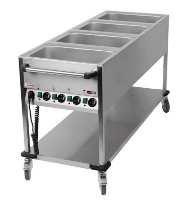 Baño Maria eléctrico con carro y capacidad de 4 bandejas GN 1/1 200 mm. Fabricada en acero inoxidable.