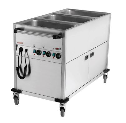 Baño Maria eléctrico con carro y capacidad de 3 bandejas GN 1/1 200 mm. Armario caliente inferior. Fabricada en acero inoxidable.