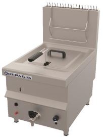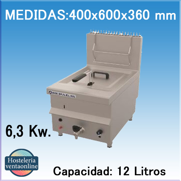 Modelos a gas: acabado exterior y tapa de acero inoxidable AISI-304 (18/10) con acabado scotch, frontal completamente registrable, con piloto de encendido manual y con piezoelectrico termopar regulación por valvula termostatica EUROSIT 630, con termostato de seguridad adicional de calibracion fija a 230ºC y quemadores fabricados en acero inoxidable perforados mediante láser. Sistema patentado de funcionamiento a traves de perneos comunicantes difusores del calor, garantizando un aumento de la temperatura uniforme desde el nivel inferior del aceite consiguiendo mayor rendimiento con menor consumo. No recomendable para freir con producto harinado.