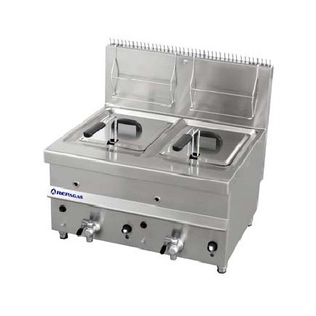 Modelos a gas: acabado exterior y tapa de acero inoxidable AISI-304 (18/10) con acabado scotch, frontal completamente registrable, con piloto de encendido manual y con piezoelectrico termopar regulación por valvula termostatica EUROSIT 630, con termostato de seguridad adicional de calibracion fija a 230ºC y quemadores fabricados en acero inoxidable perforados mediante láser. Sistema patentado de funcionamiento a traves de perneos comunicantes difusores del calor, garantizando un aumento de la temperatura uniforme desde el nivel inferior del aceite consiguiendo mayor rendimiento con menor consumo. No recomendable para freir con producto harinado.