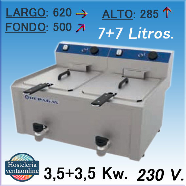 Freidora Eléctrica fabricada en una sola pieza en acero inoxidable sin juntas ni soldaduras. Capacidad de 7+7 Litros y potencia de 3,5+3,5 Kw.