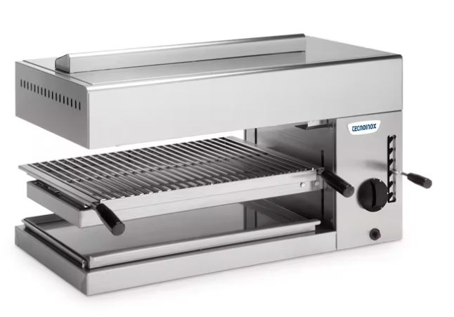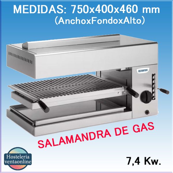 Salamandra a Gas, utilizado en las cocinas industriales con medidas:750x400x460 mm. y Potencia de 7,4 Kw. Ofrece el máximo rendimiento gracias a la cocción de 2 quemadores con llama piloto y termopar de seguridad. Encimera Móvil.
