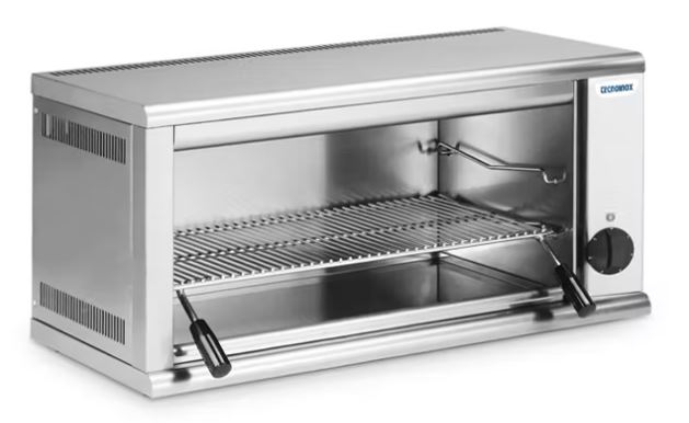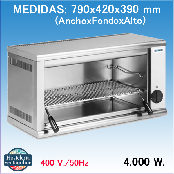 Salamandra Ultrarrápida Eléctrica, utilizado en las cocinas industriales con medidas: 790x420x390 mm. y Potencia de 4.000 w. Ofrece el máximo rendimiento gracias a la cocción por infrarrojos.