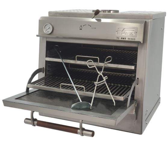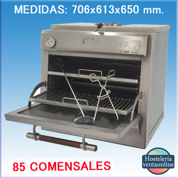 El Horno brasa pira 70 SILVER SD de PIRA, es aconsejable para 85 comensales, tiene 7 guías en el interior y la calidad-Precio es inmejorable. El Horno PIRA 70 SILVER SD, HORNO Brasa de PIRA, esta construido interiormente en hierro fundido con la terminacion integra en Acero inoxidable, recogedor de grasas y cajón recogecenizas. Termómetro y regulador de tiro incorporado. Sistema de Refrigeración Piracold.