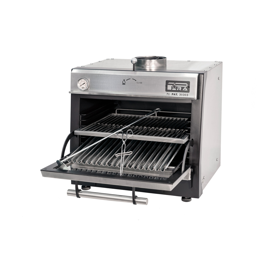 El Horno brasa pira 80 LUX de PIRA, es aconsejable para 115 comensales, tiene 7 guías en el interior y la calidad-Precio es inmejorable. El Horno PIRA 80 LUX, HORNO Brasa de PIRA, esta construido interiormente en hierro fundido con la terminacion en acero inoxidable y el marco de la puerta en negro, recogedor de grasas y cajón recogecenizas. Termómetro y regulador de tiro incorporado. Sistema de Refrigeración Piracold.