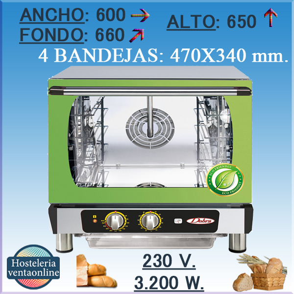 Horno CONBEQ Ecológico para locales sin salida de humos, Convección QUARTZ TURBO ECO, para panadería-pasteleria con 4 bandejas de 470x340 mm.