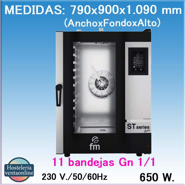 Se Utiliza en Gastronomia. Medidas:790x790x1090 mm.(AnchoxFondoxAlto) y Potencia de 650 w. Equipado con mando analógico, puede albergar de 11 Bandejas GN 1/1, según la profundidad.El Horno eléctrico FM STG 111 V7 GAS, esta pensado para utilizarlo en Gastronomía y Restauración.