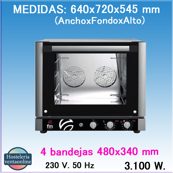 Se Utiliza en Repostería. Medidas:640x720x545 mm.(AnchoxFondoxAlto) y Potencia de 3100 w. Equipado con con panel de control manual muy fácil de usar, puede albergar 4 Parrillas.El Horno eléctrico FM RX 424 HG, esta pensado para utilizarlo en Pastelería y Panadería.