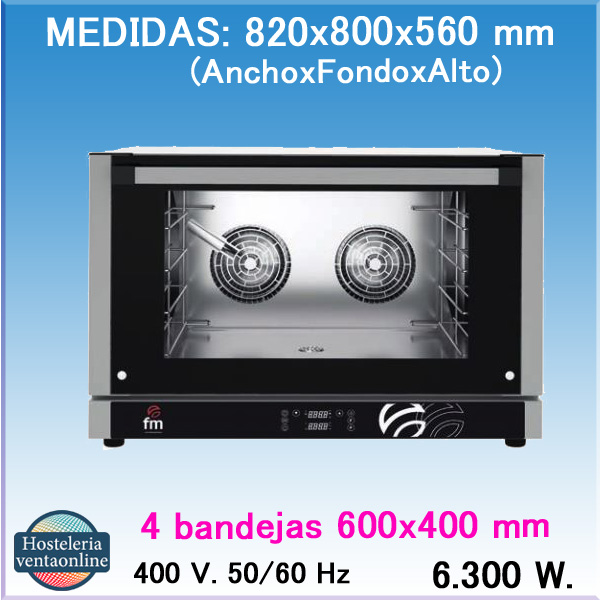 Se Utiliza en Repostería. Medidas:820x800x560 mm.(AnchoxFondoxAlto) y Potencia de 6300 w. Equipado con con panel de control manual muy fácil de usar, puede albergar 4 Parrillas.El Horno eléctrico FM RXD 604 Plus, esta pensado para utilizarlo en Pastelería y Panadería.