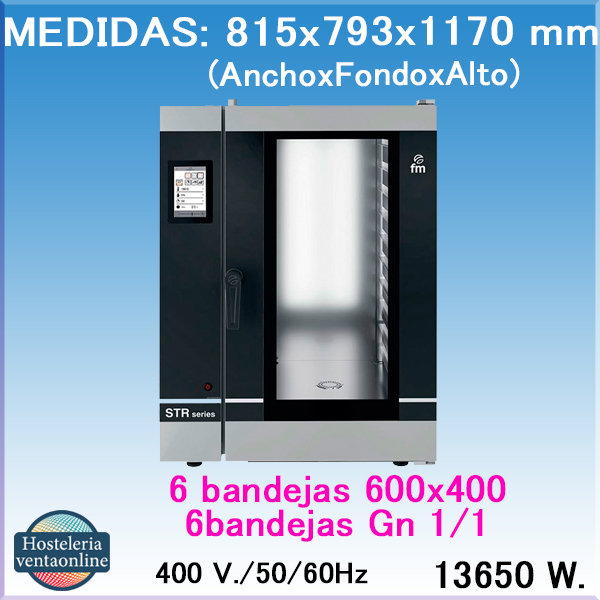 Se Utiliza en Gastronomia. Medidas:815x793x1170 mm.(AnchoxFondoxAlto) y Potencia de 13.650 w. Equipado con panel de control digital muy fácil de usar, puede albergar de 6 Bandejas 600x400 ó 6 Bandejas GN 1/1.El Horno eléctrico FM STR 610 V1, esta pensado para utilizarlo en Gastronomía y Restauración.