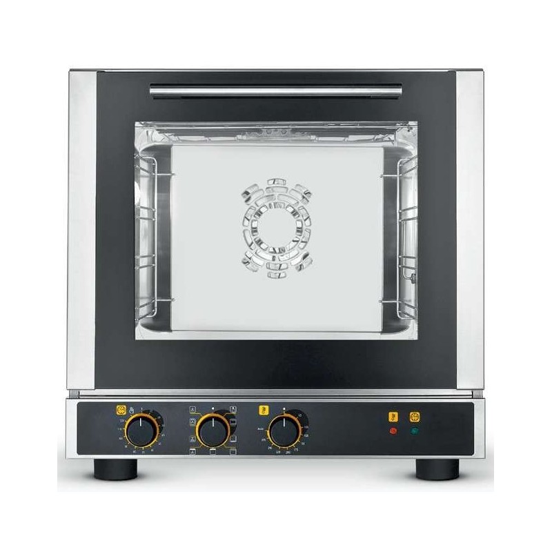 Horno Eléctrico, utilizado en las cocinas industriales con medidas:590x695x590 mm. y Potencia de 2.600 w. Equipado con mandos analógicos manuales muy fácil de usar. Puede albergar hasta 4 Bandejas 429x345 mm.