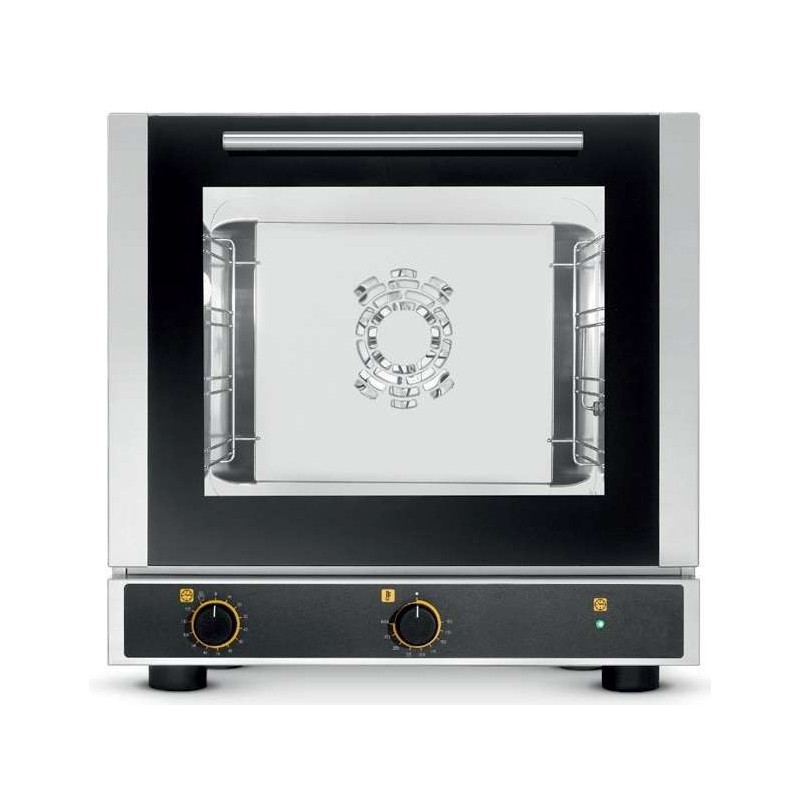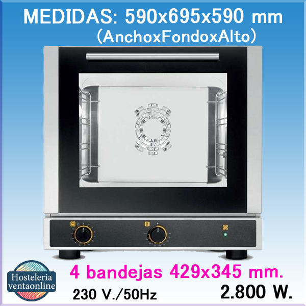 Horno Eléctrico, utilizado en las cocinas industriales con medidas:590x695x590 mm. y Potencia de 2.800 w. Equipado con mandos analógicos manuales muy fácil de usar. Puede albergar hasta 4 Bandejas 429x345 mm.