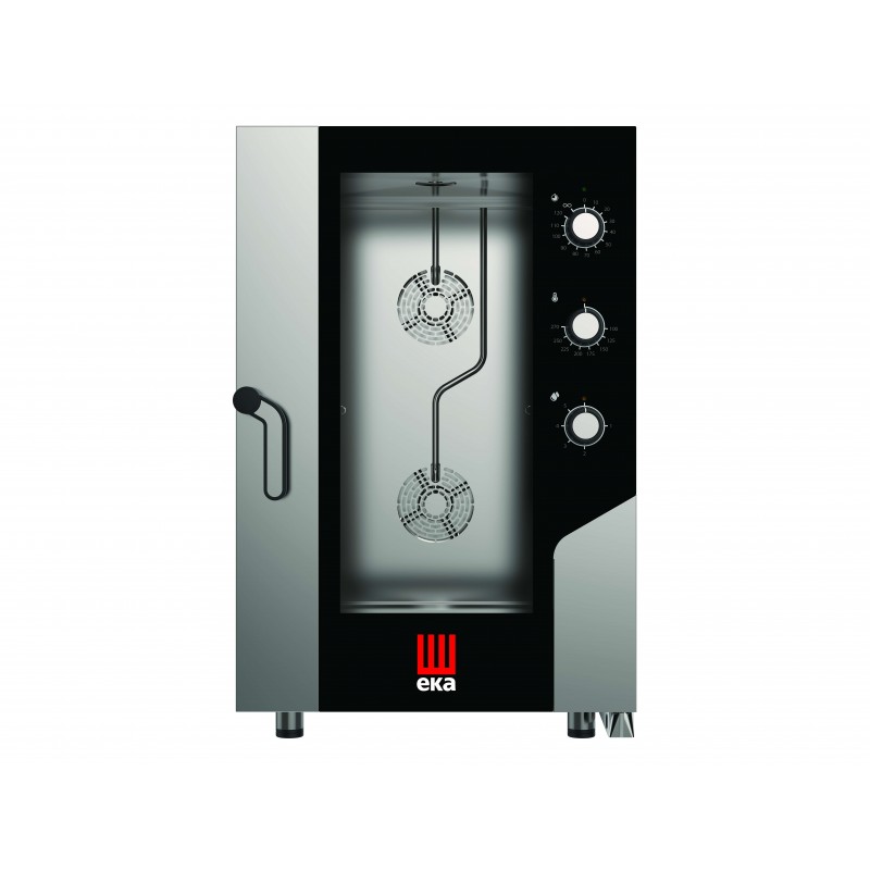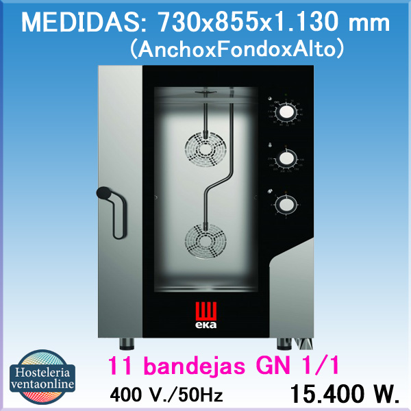 Horno Eléctrico, utilizado en las cocinas industriales con medidas:730x855x1130 mm. y Potencia de 15.400 w. Equipado con mandos analógicos manuales muy fácil de usar. Puede albergar hasta 11 Bandejas GN 1/1.
