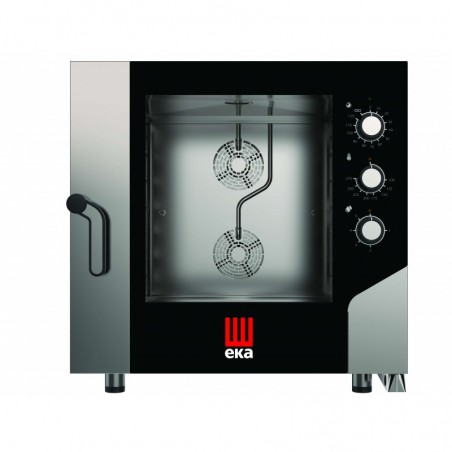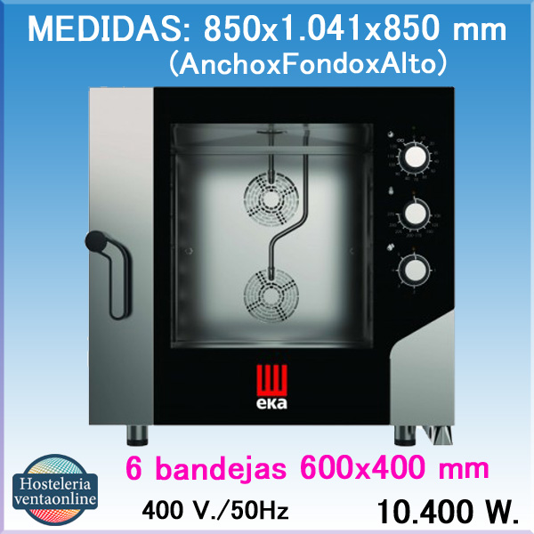 Horno Eléctrico, utilizado en las cocinas industriales con medidas:850x1041x850 mm. y Potencia de 10.400 w. Equipado con mandos analógicos manuales muy fácil de usar. Puede albergar hasta 6 Bandejas 600x400 mm.