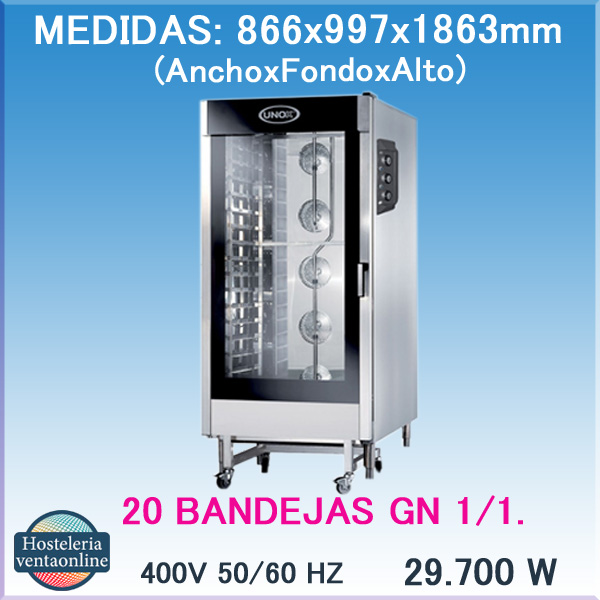 Horno de conveccion Eléctrico UNOX, desarrrollado para garantizar unos procesos de cocción uniformes y eficaces. Con capacidad para 20 bandejas GN 1/1.