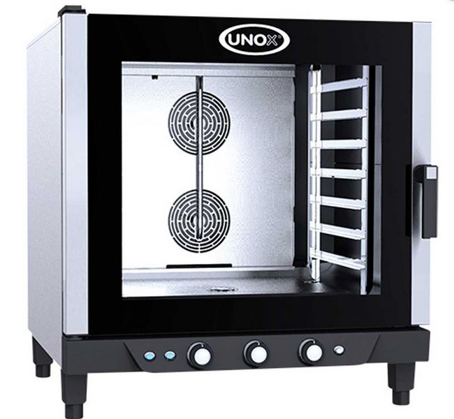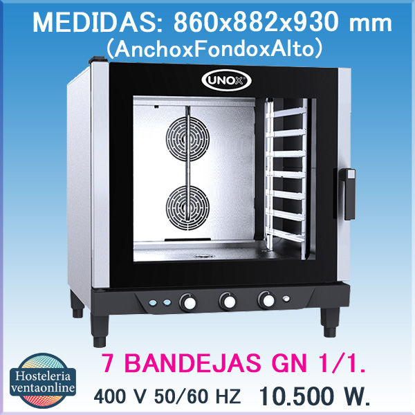 Tiene capacidad para 7 bandejas GN 1/1, 2 motores, 2 turbinas con inversión de giro y sistema de humedad.Temperatura regulable de 30ºC a 260ºC, puede aportar humedad a partir de los 48ºC.