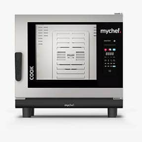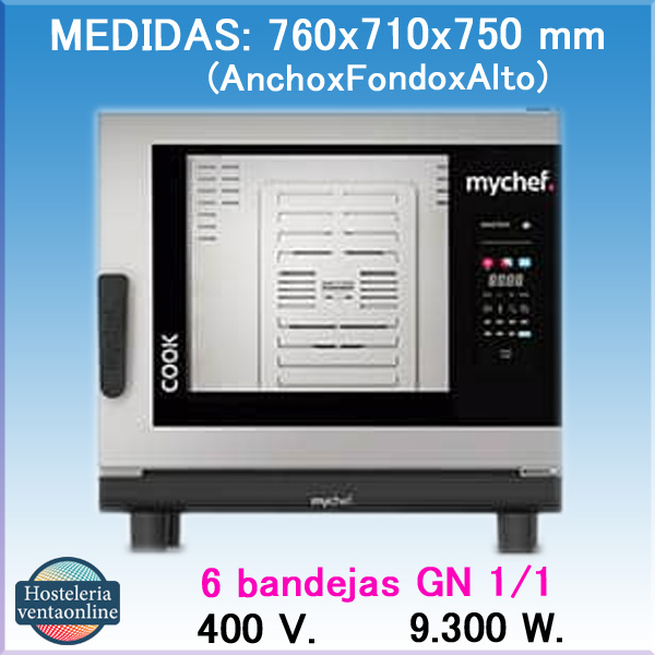 Horno con generación de vapor directo. Eléctrico de 6 bandejas GN 1/1. Dimensiones de 76x71x75 Cm y 9,3 Kw de potencia. Viene de serie con conexión trifásica y opcional monofásica. La Apertura de la puerta de mano derecha a izquierda es opcional. Recomendado para unas 40 a 110 comidas por día. Sistema Automático de Limpieza.