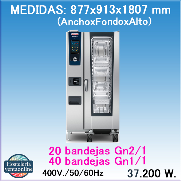 Se Utiliza en Hostelería y Restauración. Medidas:877x913x1807 mm.(AnchoxFondoxAlto) y Potencia de 37.200 w. Equipado con con panel de control digital muy fácil de usar, puede albergar 20 bandejas Gn2/1 ó 40 bandejas Gn1/1.El Horno eléctrico RATIONAL iCombi Pro 20-1/1, esta pensado para utilizarlo en Hostelería y Restauración.