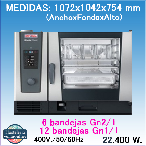 Se Utiliza en Hostelería y Restauración. Medidas:1072x1042x754 mm.(AnchoxFondoxAlto) y Potencia de 22.400 w. Equipado con con panel de control digital muy fácil de usar, puede albergar 6 bandejas Gn2/1 ó 12 bandejas Gn1/1.El Horno eléctrico RATIONAL iCombi Classic 6-2/1, esta pensado para utilizarlo en Hostelería y Restauración.