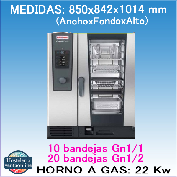 Se Utiliza en Hostelería y Restauración. Medidas:850x842x1014 mm.(AnchoxFondoxAlto) y Potencia Térmica mínima de 22.000 w. Equipado con con panel de control digital muy fácil de usar, puede albergar 10 bandejas Gn1/1 ó 20 bandejas Gn1/2.El Horno a Gas RATIONAL iCombi Classic 10-1/1, esta pensado para utilizarlo en Hostelería y Restauración.