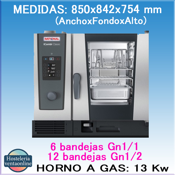 Se Utiliza en Hostelería y Restauración. Medidas:850x842x754 mm.(AnchoxFondoxAlto) y Potencia Térmica mínima de 13.000 w. Equipado con con panel de control digital muy fácil de usar, puede albergar 6 bandejas Gn1/1 ó 12 bandejas Gn1/2.El Horno a Gas RATIONAL iCombi Classic 6-1/1, esta pensado para utilizarlo en Hostelería y Restauración.