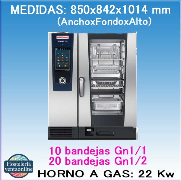 Se Utiliza en Hostelería y Restauración. Medidas:850x842x1014 mm.(AnchoxFondoxAlto) y Potencia Térmica mínima de 22.000 w. Equipado con con panel de control digital muy fácil de usar, puede albergar 10 bandejas Gn1/1 ó 20 bandejas Gn1/2.El Horno a Gas RATIONAL iCombi Pro 10-1/1, esta pensado para utilizarlo en Hostelería y Restauración.