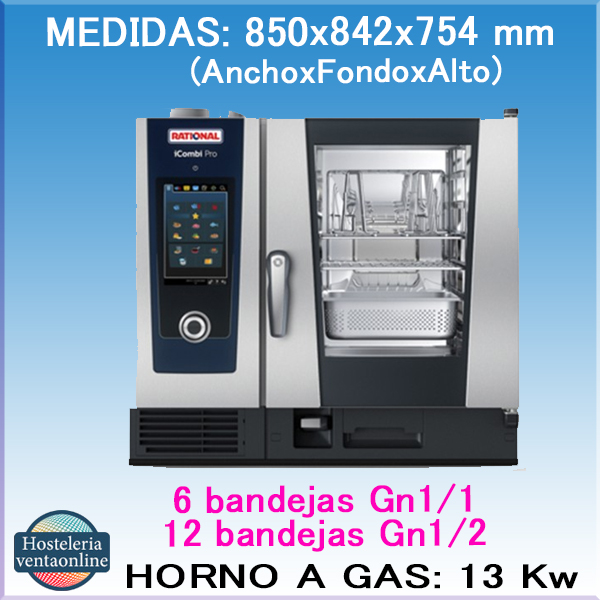 Se Utiliza en Hostelería y Restauración. Medidas:850x842x754 mm.(AnchoxFondoxAlto) y Potencia Térmica mínima de 13.000 w. Equipado con con panel de control digital muy fácil de usar, puede albergar 6 bandejas Gn1/1 ó 12 bandejas Gn1/2.El Horno a Gas RATIONAL iCombi Pro 6-1/1, esta pensado para utilizarlo en Hostelería y Restauración.