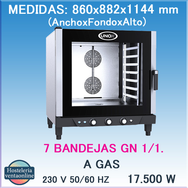 Horno de conveccion a gas UNOX, desarrrollado para garantizar unos procesos de cocción uniformes y eficaces. Con capacidad para 7 bandejas GN 1/1.