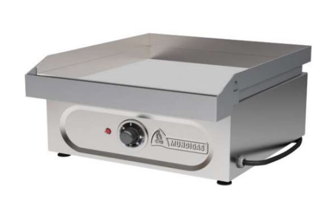 La Plancha MUNDIGAS Cromo duro Eléctrica, esta fabricada en acero inoxidable. Equipada con piloto indicador de encendido y regulación de temperatura mediante termostato, patas regulables en altura y recoge-grasas frontal de acero inoxidable. La placa rectificada es lisa con un espesor de 20 mm. y el palastro con baño de cromo duro de 60 micras. MONOFÁSICA.