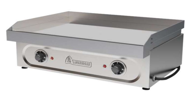La Plancha MUNDIGAS Cromo duro Eléctrica, esta fabricada en acero inoxidable. Equipada con piloto indicador de encendido y regulación de temperatura mediante termostato, patas regulables en altura y recoge-grasas frontal de acero inoxidable. La placa rectificada es lisa con un espesor de 20 mm. y el palastro con baño de cromo duro de 60 micras. MONOFÁSICA.