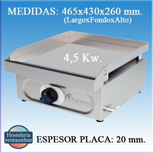 La Plancha MUNDIGAS Cromo duro a Gas, esta fabricada en acero inoxidable. Equipada con válvula termopar de seguridad, patas regulables en altura y recoge-grasas frontal de acero inoxidable. La placa rectificada es lisa con un espesor de 20 mm. y el palastro con baño de cromo duro de 60 micras. Esta disponible a gas Butano/Propano ó Gas Natural.