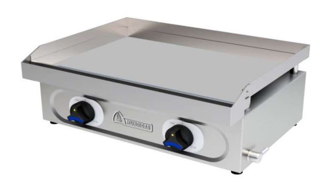 La Plancha MUNDIGAS Cromo duro a Gas, esta fabricada en acero inoxidable. Equipada con válvula termopar de seguridad, patas regulables en altura y recoge-grasas frontal de acero inoxidable. La placa rectificada es lisa con un espesor de 20 mm. y el palastro con baño de cromo duro de 60 micras. Esta disponible a gas Butano/Propano ó Gas Natural.
