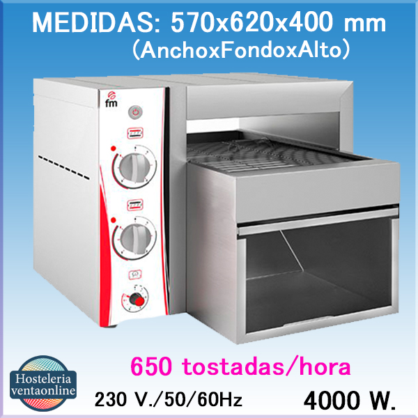 De gran capacidad y producción. Medidas:570x620x400 mm.(AnchoxFondoxAlto). Potencia de 4000 w. Equipado con control manual.El Tostador eléctrico FM TTV 4000, esta pensado para utilizarlo en hoteles y restaurantes.