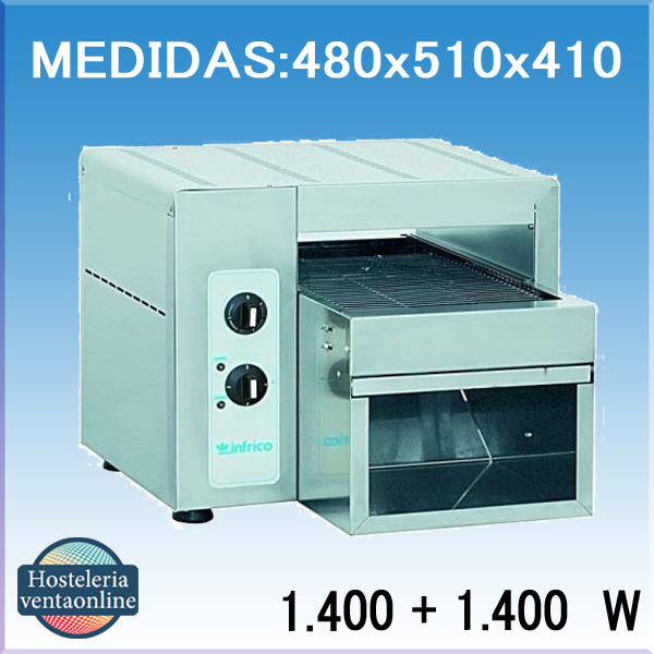Tostador De Túnel Eléctrico Industrial de cinta con avance regulable, resistencias blindadas y selector de cuatro posiciones, con potencia de 2.800 W. Ideal para los profesionales de la hosteleria.