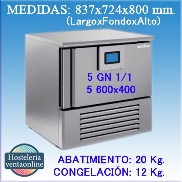 Abatidor de Temperatura de 5 bandejas Infrico, Este Abatidor de Temperatura es ideal para cocinas con espacios reducidos, puesto que tiene una capacidad para 5 bandejas GN 1/1 ó 600x400 mm. Este Abatidor nos permite bajar la temperatura de los alimentos hasta el punto de congelación, si es necesario, de manera rápida y eficaz, sin maltratar el producto. Permitiendo agilizar y adelantar los tiempos de producción y elaboración en la cocina.