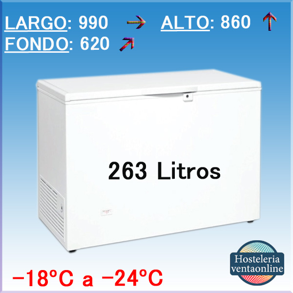 Arcón congelador tapa ciega abatible HC 320. Congelador horizontal que combina un alto rendimiento frigorífico, su temperatura oscila entre los -18ºC a los -24ºC, con la eficiencia energética que le confiere el uso del gas R-600A de bajo impacto ambiental. El sistema de refrigeración es estático.