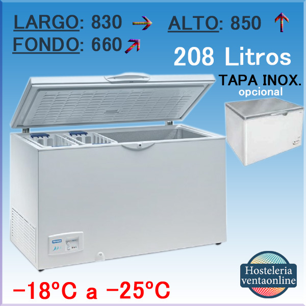 Arcon congelador tapa abatible. Medidas:830x660x850 mm. Con Capacidad de 208 Litros y Controlador analógico.