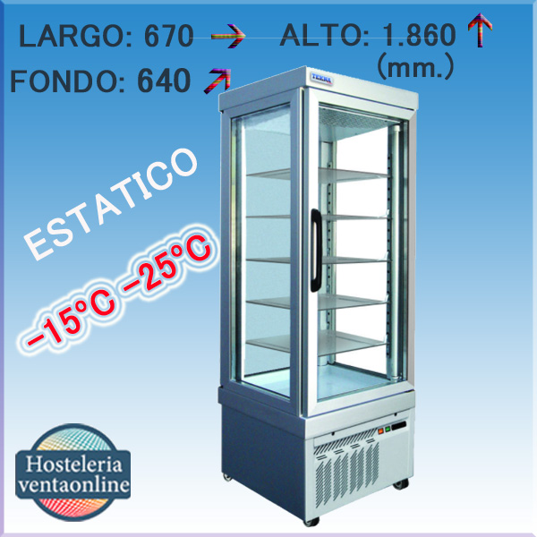Vitrina Congelación especial para la exposición de tartas y dulces con 3 caras de cristal y 1 Puerta. Refrigeración Estática.