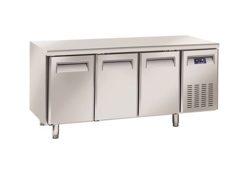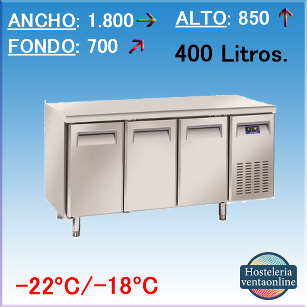 Mesa de congelación sin peto de 3 puertas y capacidad de 400 litros, con medidas: 1.800x700x850 mm.Fabricado en acero inoxidable AISI 304.