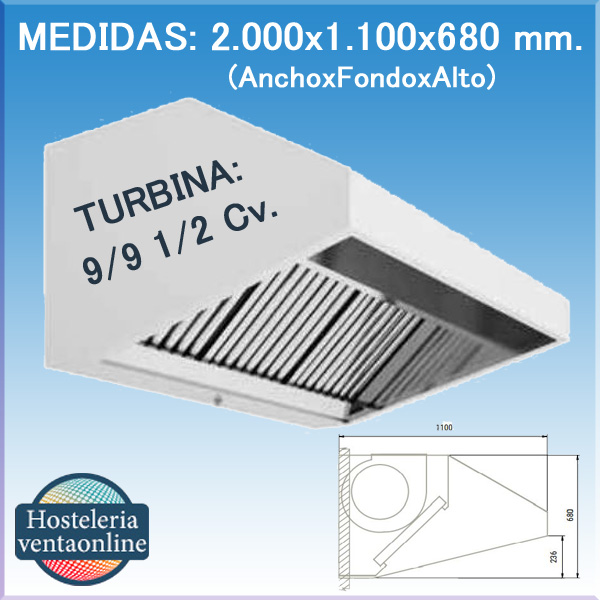Campana de 2 metros de largo con Turbina para montar en pared. Fabricada en Acero Inoxidable. IMPRESCINDIBLE en Cocinas Industriales para la extracción de todos los Olores, grasas y humos. CONSULTAR A NUESTRO DEPARTAMENTO TÉCNICO EL MOTOR ADECUADO.