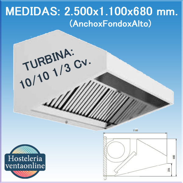Campana de 2,5 metros de largo con Turbina para montar en pared. Fabricada en Acero Inoxidable. IMPRESCINDIBLE en Cocinas Industriales para la extracción de todos los Olores, grasas y humos. CONSULTAR A NUESTRO DEPARTAMENTO TÉCNICO EL MOTOR ADECUADO.
