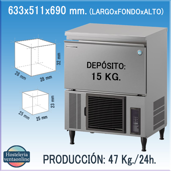 Maquina de hielo con Producción: 47 Kg/24h y cubito de 23 ó 13 gramos (28x28x32 y 25x25x23 mm.), con cuerpo en acero inoxidable, robusto, con patas y perfecto para disponer bajo el mostrador.