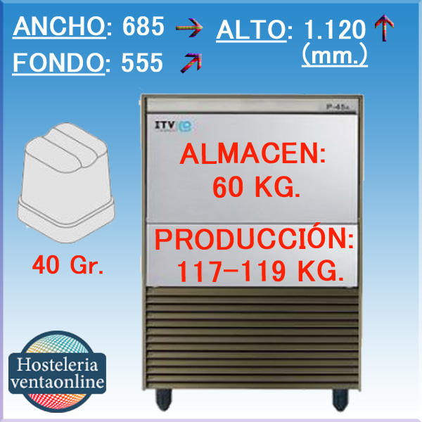 DescripciónFabricador de hielo ITV PULSAR 115, cubito Gourmet de 40 gramos y Almacén de 60 Kg.