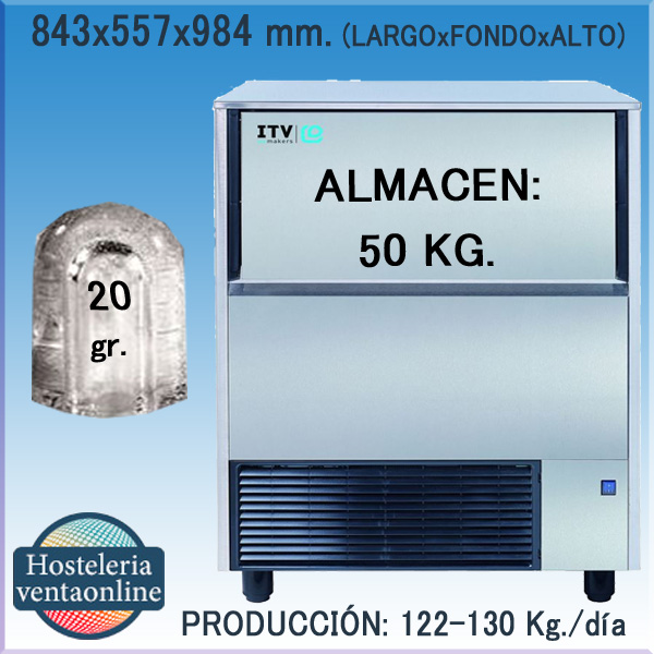 Maquina de hielo con Producción 122-130 Kg/24h y cubito de 20 cm³, con cuerpo en acero inoxidable, robusto, con patas y perfecto para disponer bajo el mostrador. Enfriamiento Aire/Agua.