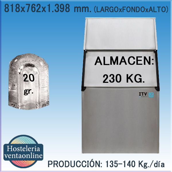 Maquina de hielo con Producción 135-140 Kg/24h y cubito de 20 cm³, con cuerpo en acero inoxidable, robusto, con patas y perfecto para disponer bajo el mostrador. Enfriamiento Aire/Agua.