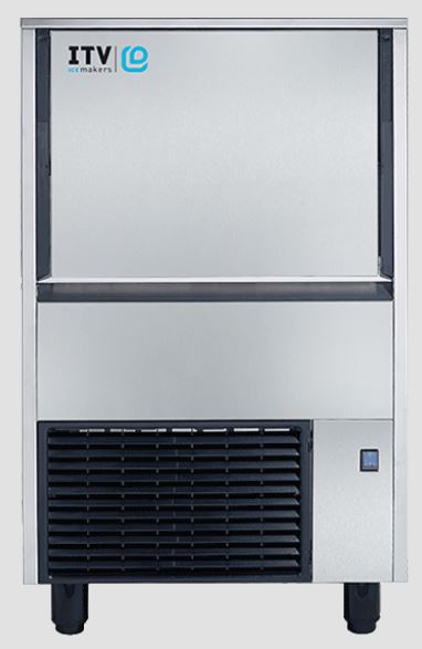 Maquina de hielo con Producción 53-54 Kg/24h y cubito de 20 Gramos, con cuerpo en acero inoxidable, robusto, con patas y perfecto para disponer bajo el mostrador. Enfriamiento Aire/Agua.